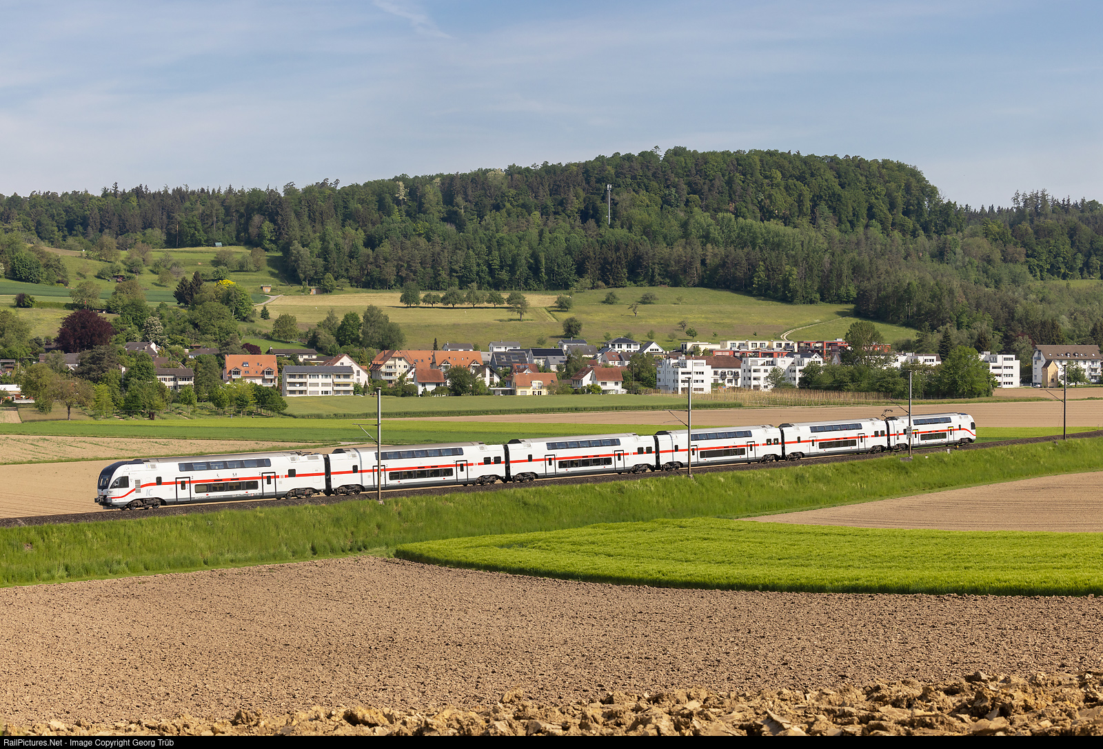 | The six car doubledeck Intercity train 4010 # 008 (IC2) or "4108" with the name "Hegau" of the Deutsche Bahn is running the IC 380 from Zürich via Singen to Stuttgart, between Rafz and Lottstetten. The journey time is 3 hours and 9 minutes. This is the only multiple unit of this type 4010 with one-piece doors, from the second series of trains delivered by StadlerRail to the Westbahn in Austria, which were taken over by Deutsche Bahn. |