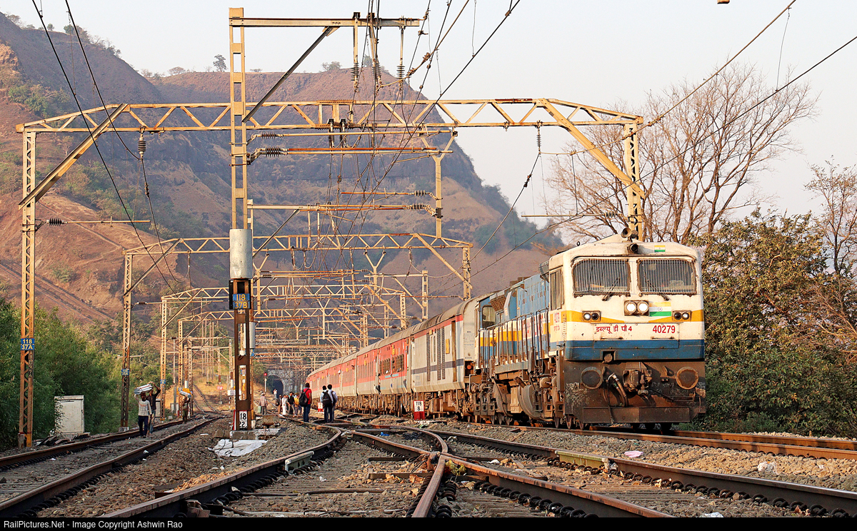 | 17613 Panvel Nanded express up the Bhore ghats towed by Krishnarajapuram shed's WDP4d #40279 at Monkey Hill Cabin. This is mid of Bhore Ghats. The catch siding is clearly visible to the left. This is considered as a technical halt (brake test halt precisely) for the trains down the Ghats. |