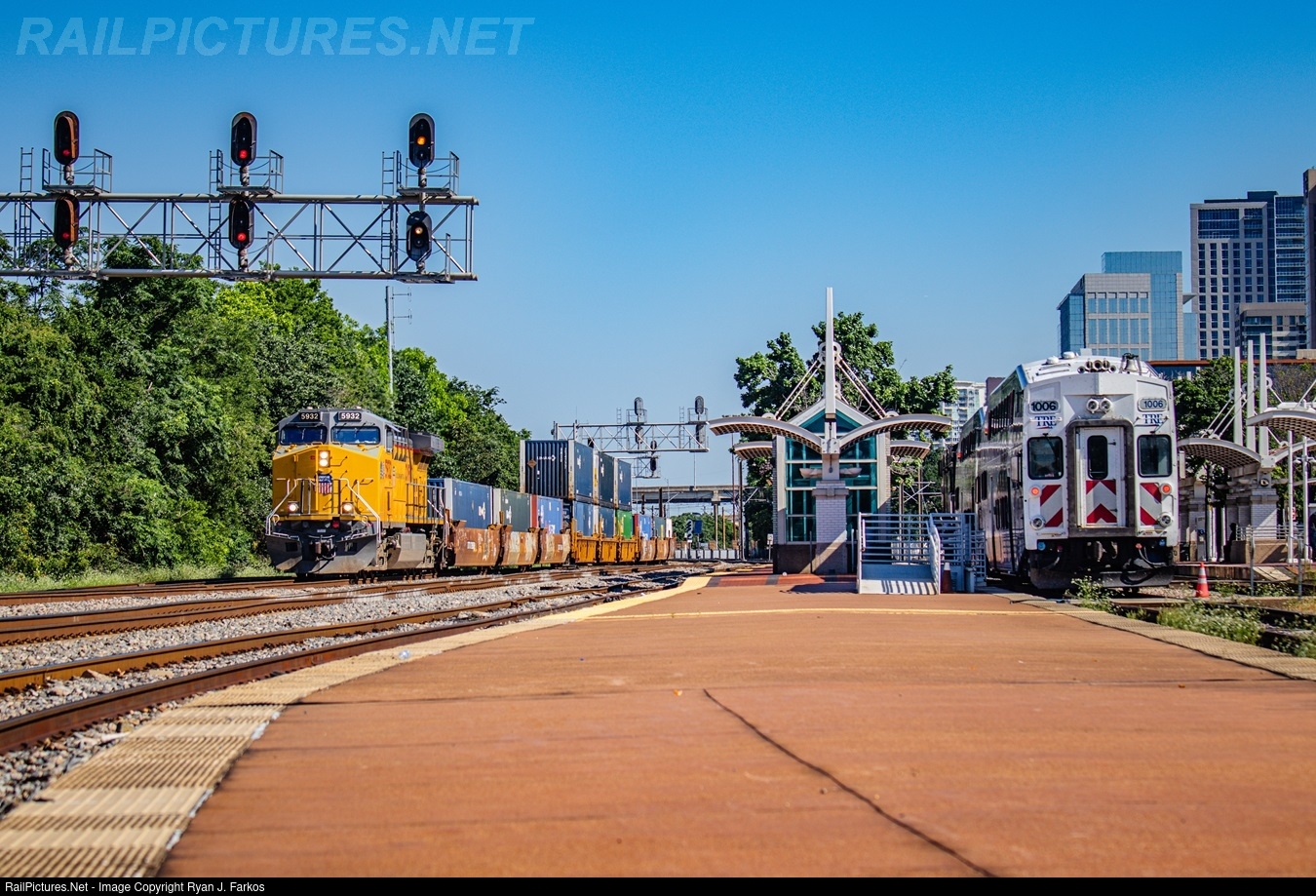 | UP 5932 leads an eastbound MLDDI through Dallas Union Station as a Trinity Railway Express commuter trains awaits its westward departure towards downtown Fort Worth |