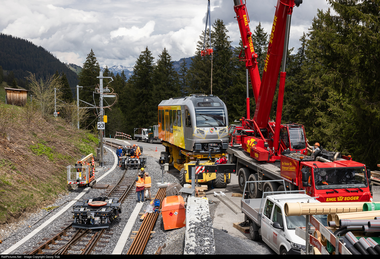 The Lauterbrunnen-Mürren mountain railroad (BLM), which belongs to the Jungfraubahn Holding, consists of an aerial cableway from Lauterbrunnen to Grütschalp and a meter-gauge adhesion railroad a good 4 kilometers long from Grütschalp via the Winteregg crossing station to Mürren. StadlerRail is supplying three new Be 4/6 # 101 to # 103 double railcars for the Grütschalp-Mürren line. The first vehicle # 102 was delivered in October 2023 already for tests. On 13 and 14 May 2024, the two car bodies of train # 101 "Eiger" were transported by special transport from Lauterbrunnen (797 meter a.s.l.) via mountain roads to Winteregg (1578 meter a.s.l.), where they were mounted on the bogies. The first car of train # 101 is ready in Winteregg to be unloaded from the Castor+Pollux transporter to the bogies, which were placed on the track already. The catenary was removed temporarily here.