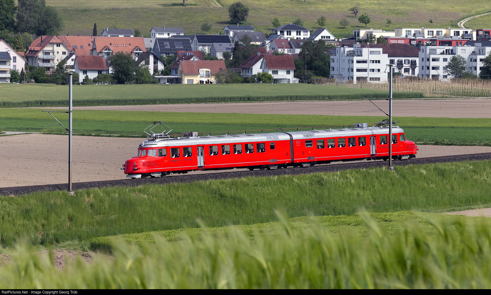 | The iconic double red arrow "Churchill-Pfeil" RAe 4/8 # 1021 of of the SBB, built in 1939, is on the way from Zürich via Bülach-Eglisau to Schaffhausen for taking passengers for a journey. The train is now between Rafz and Lottstetten. |