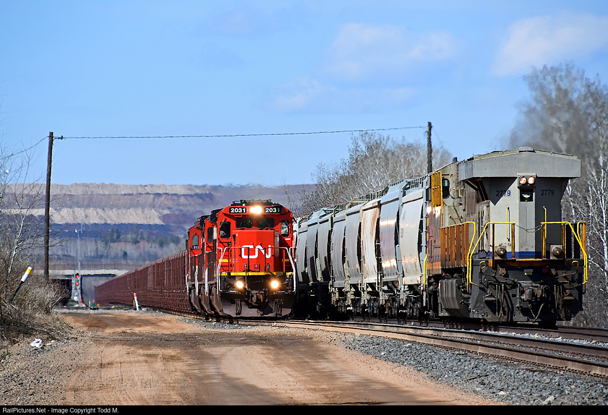 | Loaded iron ore train from the Minorca mine to Two Harbors, MN slowly creeps down the siding at Virginia while a loaded sand train is full throttle gaining speed and momentum about to start the climb up the south side of the Laurentian Divide as they continue to Canada on the CN Rainy sub. |