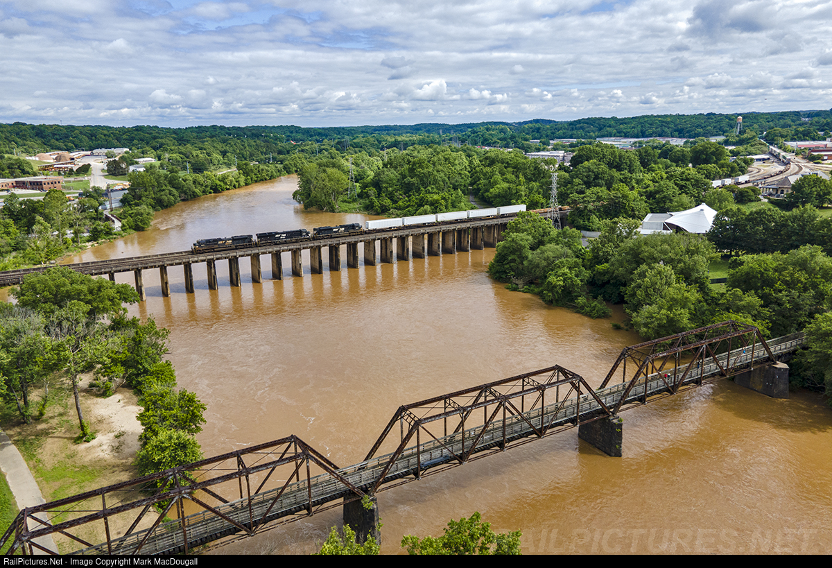The Atlanta to Croxton UPS train heads over the Dan River behind an EMD leader as they pass through Danville.