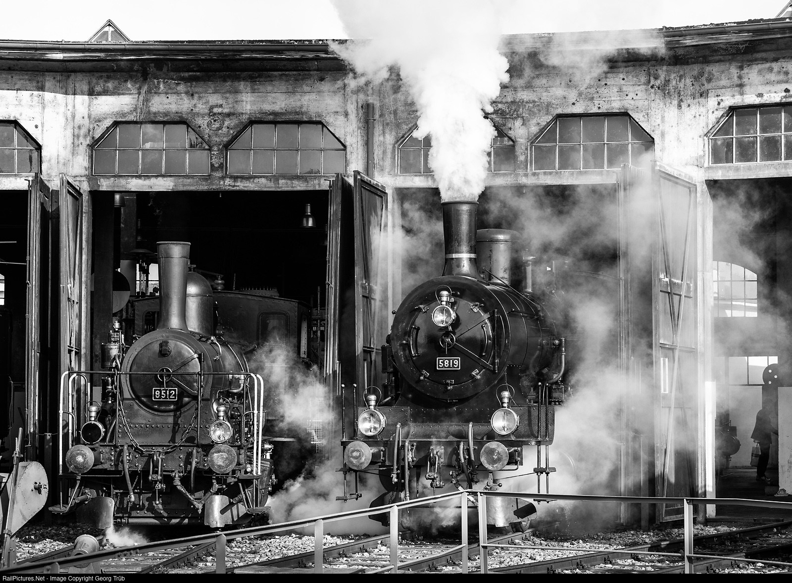 | Shunter "Tigerli" E 3/3 # 8512 of the association steam group Zürich and "Habersack" Eb 3/5 # 5819 of SBB Historic in the roundhouse of Bahnpark Brugg AG. |