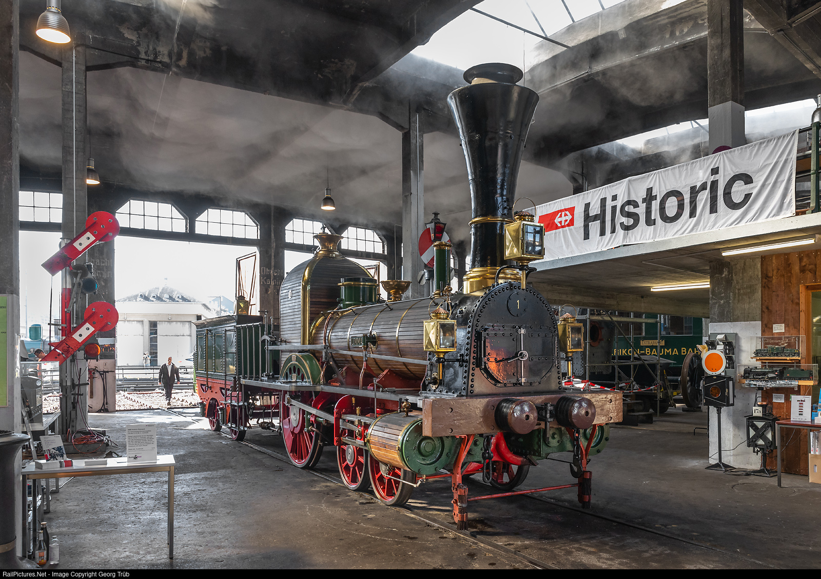 Replica of 1947 of the very first steamlocomotive of Switzerland, the D 1/3 # 1 "Limmat" of the Schweizerische Nordbahn (SNB) from Baden to Zürich of 1847. The 4-2-0 was built by Maschinenbau-Gesellschaft Karlsruhe of Emil Kessler in Germany. The Replica was built by the SLM and the SBB workplace Zürich in 1947, using some parts (mainly the axles and fittings) of the locomotive Eb 2/4 # 15 "Speiser" of the former Schweizerische Centralbahn from 1857. In the roundhouse of the Bahnpark Brugg AG on the open doors days 2024, not under pressure.