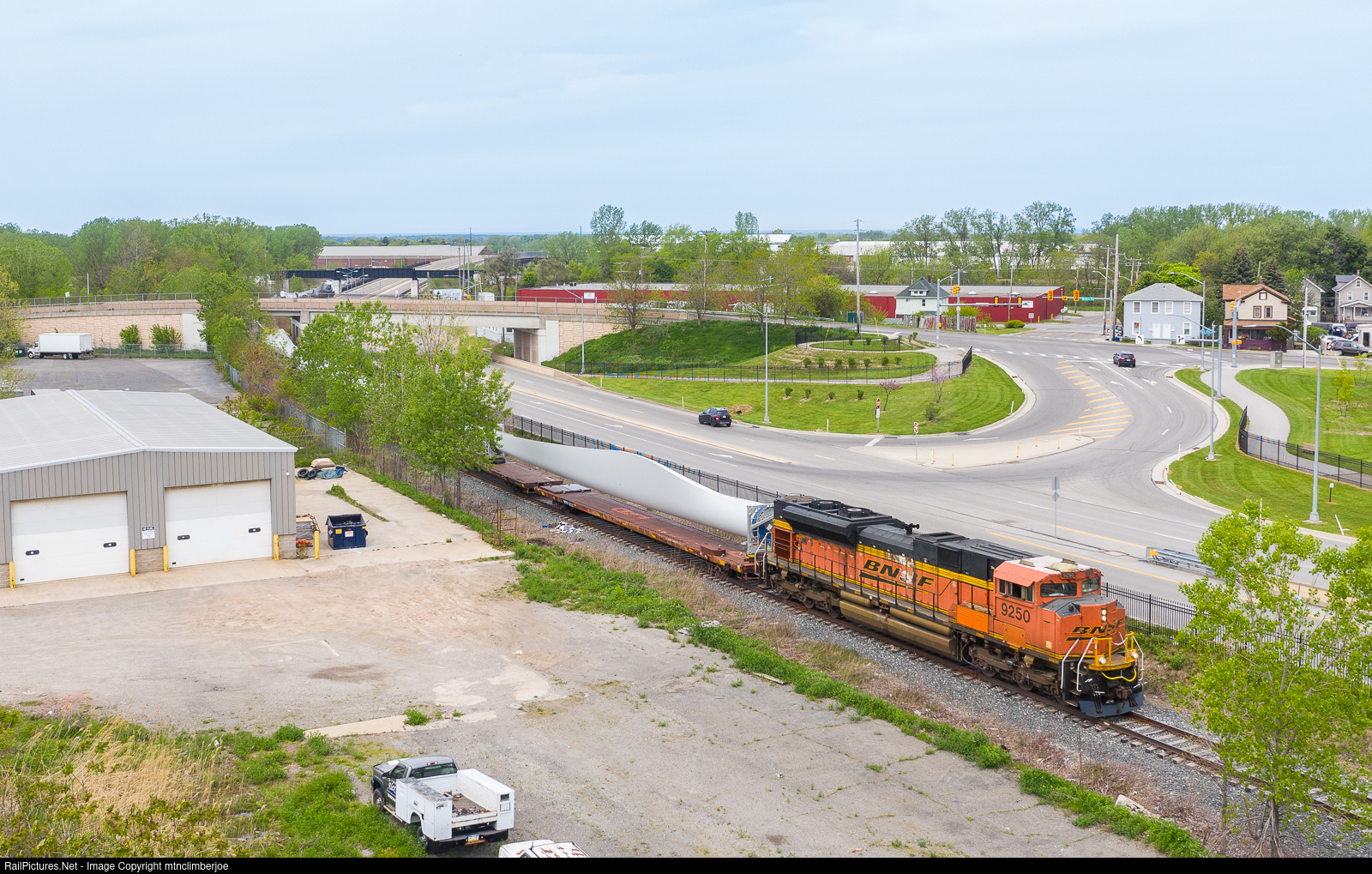 | With a BNSF SD70ACe leading the way, a Buffalo & Pittsburgh crew has taken over loaded wind turbine blade train S990 after receiving it from CSX at OD Yard and is starting their trip down the BPRR A&E Subdivision alongside the Bayfront Connector in Erie, Pennsylvania. This train is bound for DuBois, where the blades will be unloaded and transported to the installation site. |