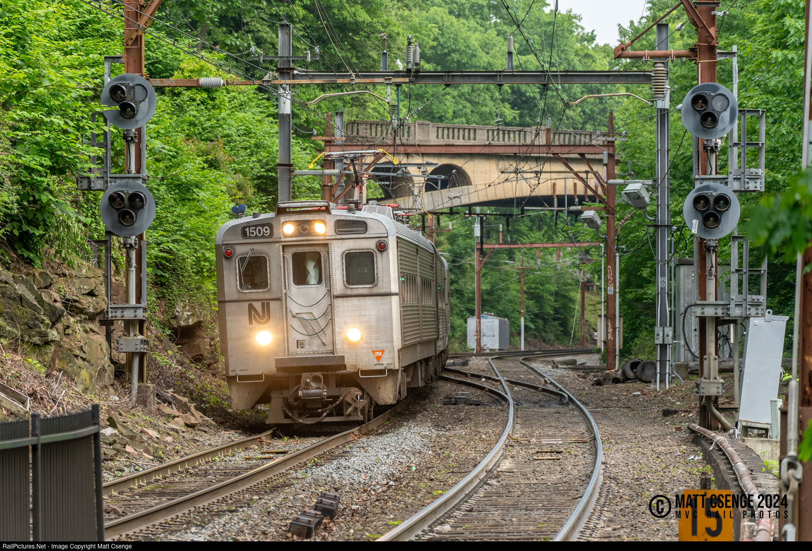 NJ Transit Arrow III car no. 1509 is the lead unit on Montclair-Boonton Line train 208, seen approaching Glen Ridge Station. The signals here at CP Glen are approach lit, and appear to only activate for trains within the block proceeding them - they illuminated immediately as the train passed and entered the signal block.