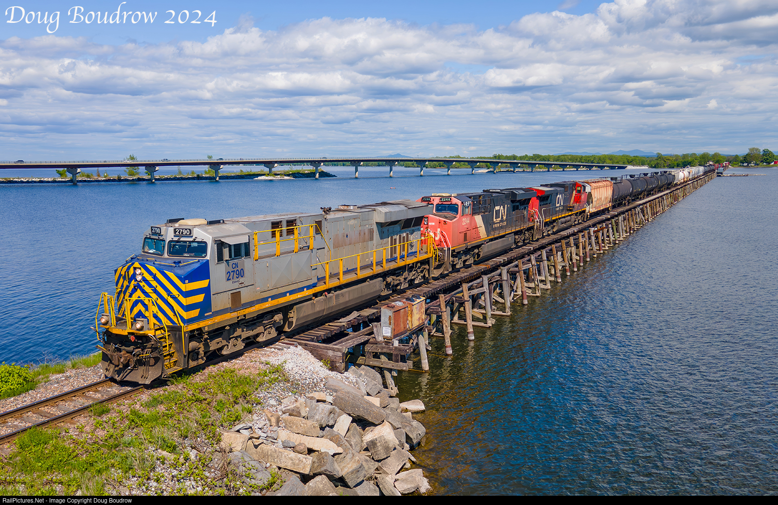 | After interchanging at New England Central (former Central Vermont) Italy Yard in Saint Albans, Canadian National train 323 is seen crossing the 3800-foot trestle over Missisquoi Bay at the Northern end of Lake Champlain. The train originates in Montreal as 324 and proceeds to Saint Albans returning as 323. This job currently runs three times a week. |
