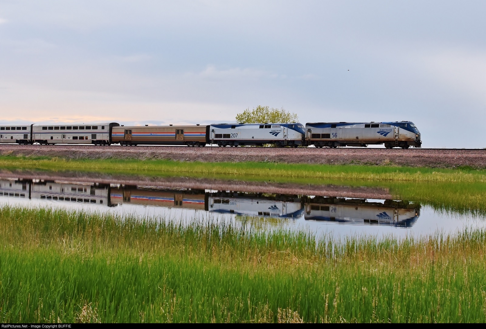 The California Zephyr casts a reflection at Barr Lake as it heads towards Denver, Colorado on the Brush Sub.