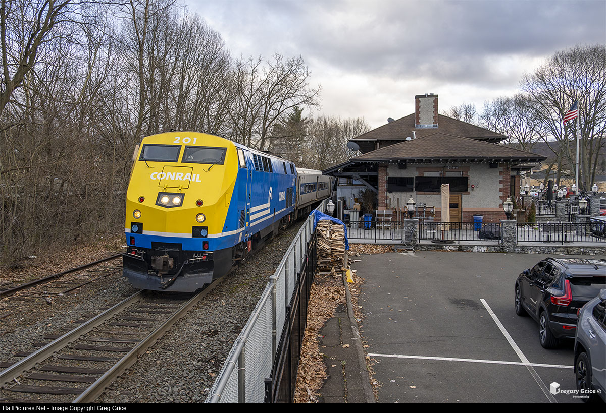 On the afternoon of April 4th, 2024, Metro-North's 40th Anniversary "Conrail" heritage-wrapped P32AC-DM, MNCW 201, leads train 1942 into the station stop while passing the former depot-turned restaurant at Naugatuck, Connecticut on the Waterbury Branch.