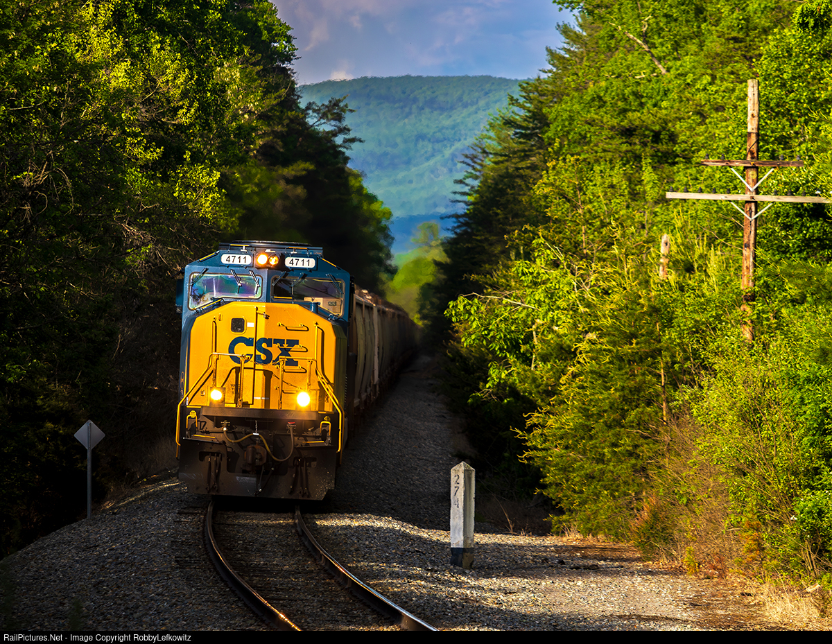Town MACs: CSXT 4711, a rebuilt SD70MAC, leads empty grain train CSX G806 westbound along the Buckingham Branch through Nicelytown, Virginia, as the train makes a final push toward Clifton Forge, Virginia.