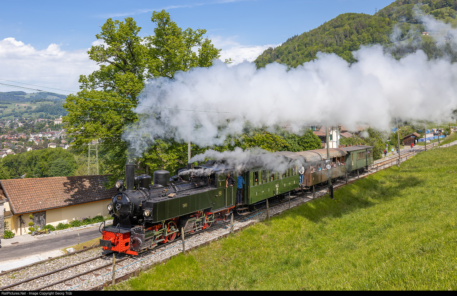 | "Mallet" steamlocomotive G 2x2/2 # 105 of the former Zell-Todtnau Railway in Germany, pulls train 19 of the Blonay-Chamby Railroad Museum from Blonay to Chamby near the Cornaux stop, during the Pentecost steam festival. |