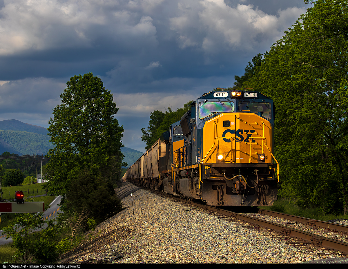 Craigsville Cruise: CSXT 4711, a freshly rebuilt SD70MAC, leads empty grain train CSX G806 west along the Buckingham Branch through Craigsville, Virginia, as storms build in the distance.