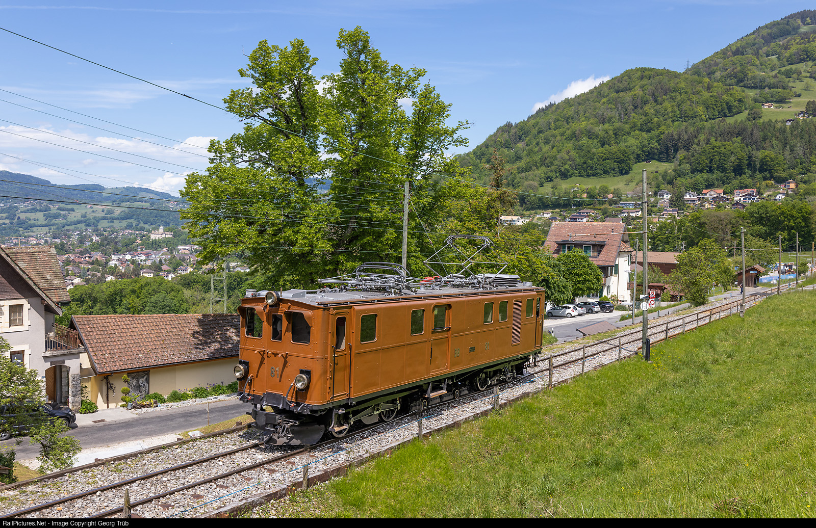 | Former Bernina Railway electrolocomotive Ge 4/4 # 81 of the Blonay-Chamby Railroad Museum is running light as train 25 from Blonay to Chamby museum, near the Cornaux stop. |