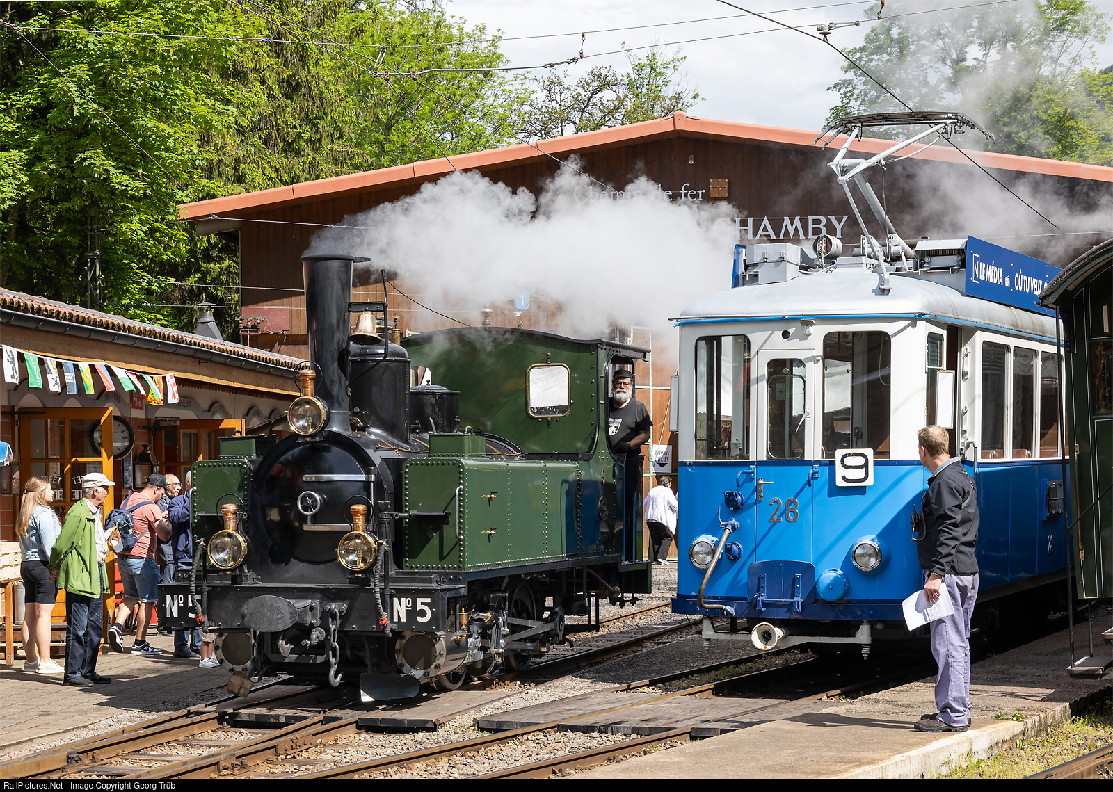 | Steamlocomotive G 3/3 # 5 of the former Lausanne-Echallens-Bercher (LEB) and tramway car Ce 2/3 # 28 former Tramways Lausannois (1913/1948) in Chamby museum during the Pentecost steam festival. |