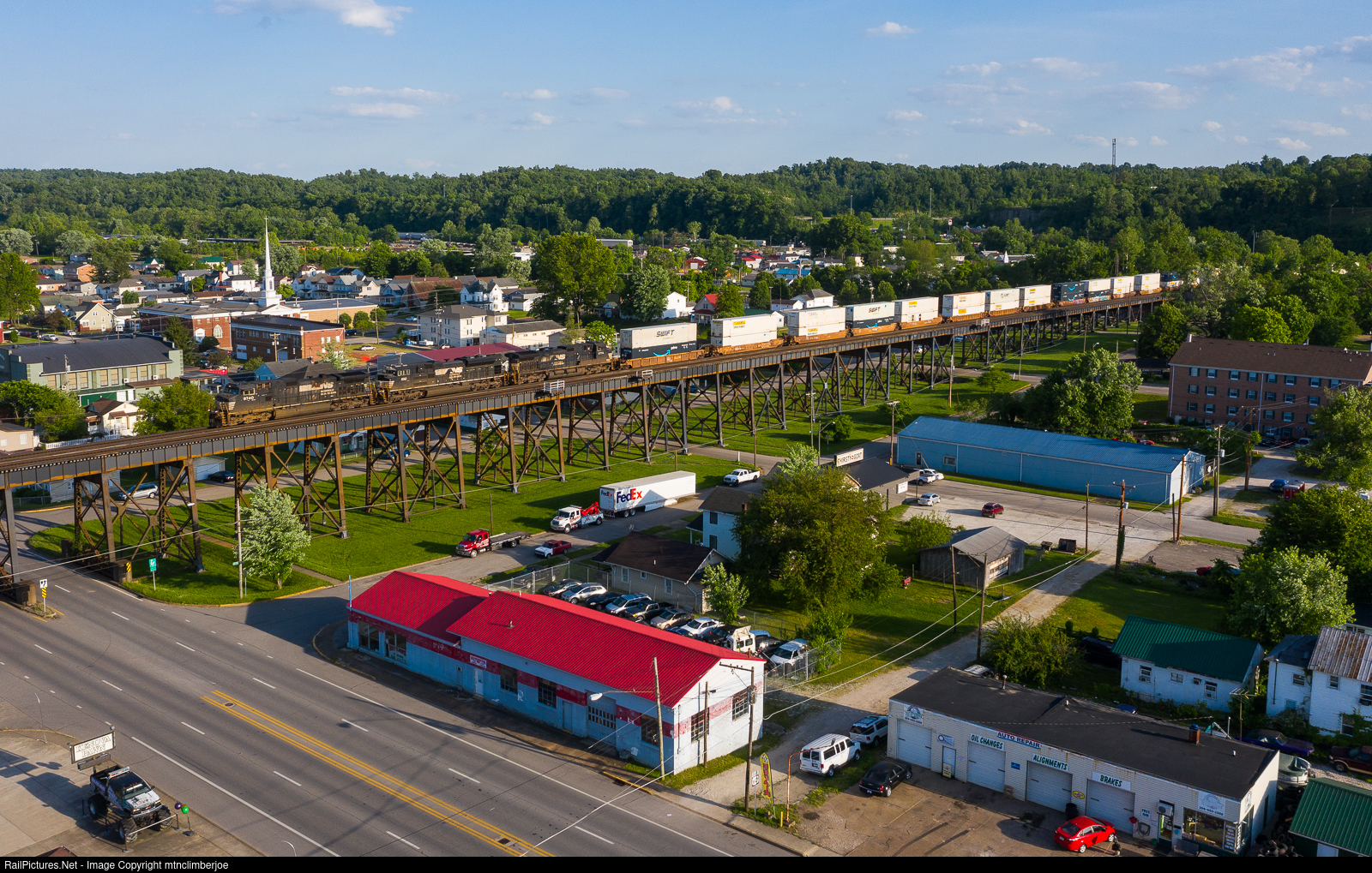 | A trio of Norfolk Southern locomotives lead intermodal train 217 as it soars over the town of Kenova, West Virginia as it approaches the bridge across the Ohio River. The approach trestle to the main span is over 2000 feet long, making up half of the bridge's total length. |