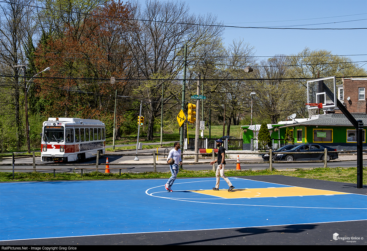 On April 14, 2024, a couple of guys play a game of basketball as SEPTA LRV 9000, painted in its as-delivered colors, rounds the Angora Loop on 61st Street & Baltimore in Philadelphia, Pennsylvania. 9000 was running on a special "Friends of Philadelphia Trolley" charter along Route 34.