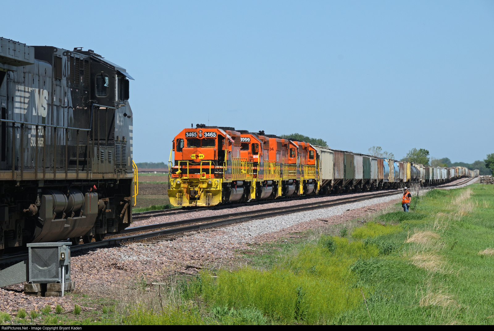 The Rapid City, Pierre & Eastern's trackage rights train from the Union Pacific interchange in Mankato to Aurora, SD is in the hole at Cobden to meet CPKC's eastbound Tracy to Chicago manifest that has some visiting NS power on the point.