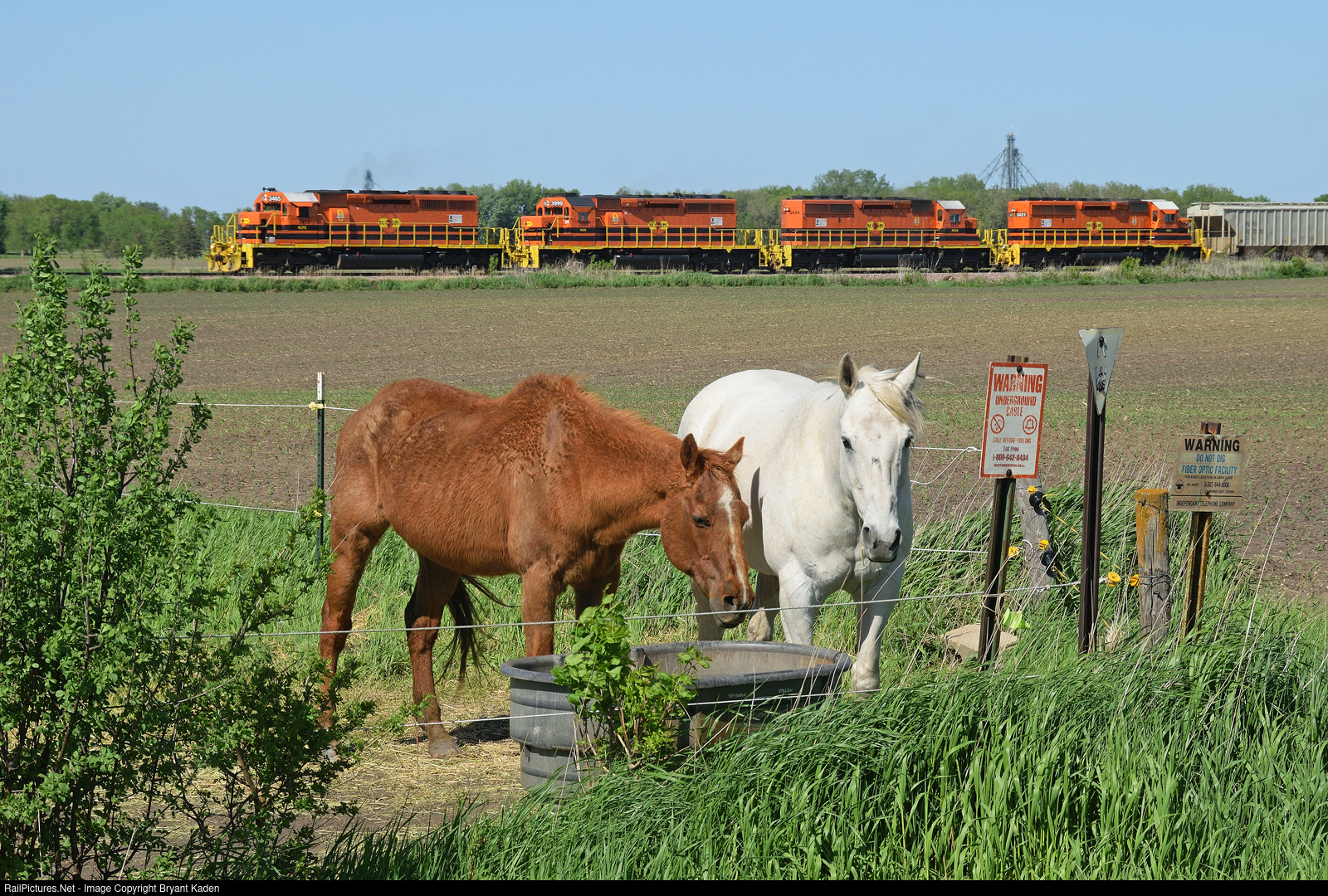 A couple of horses pause from taking a drink to cast a curious eye toward the strange bearded man holding a camera nearby. The RCPE's westbound Mankato to Aurora manifest slowly rolls toward Tracy in the distance.
