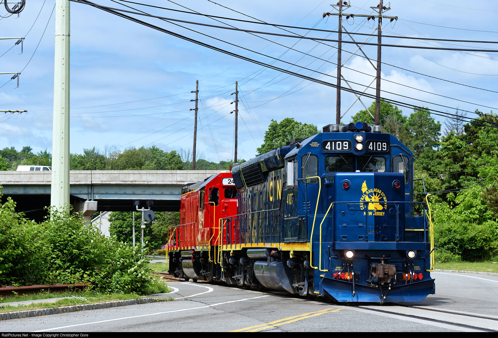 | New Jersey Transit GP40PH-2 #4109 and Morristown & Erie GP15-1 #24 heading to the Whippany Railway Museum. The 4109 will be on display to help celebrate the CNJ's 175th anniversary. |