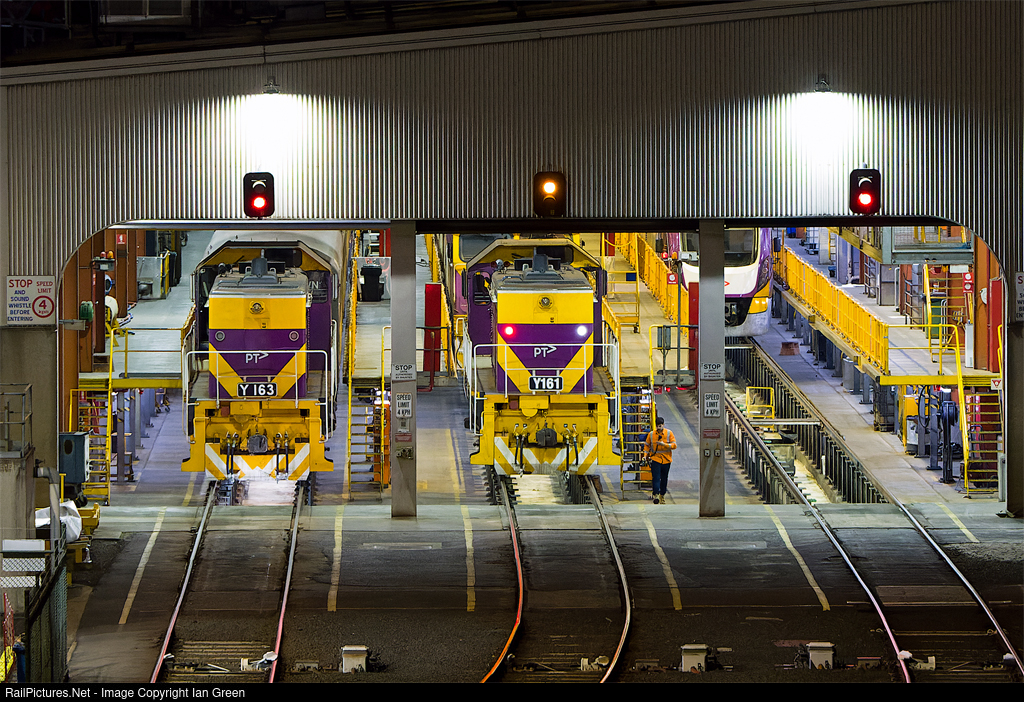 V/Line yard shunters Y163 and Y161 rest in the maintenance shed near Southern Cross Station.
