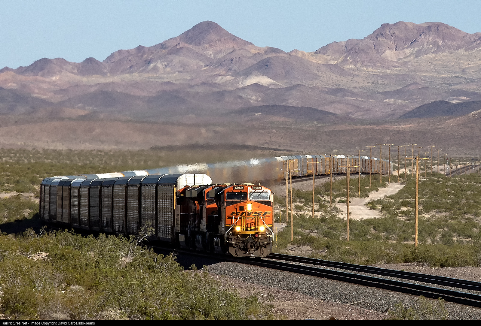 | A loaded vehicle train from Birmingham, AL to San Bernardino, CA follows hot on the heals of another westbound train through Pisgah on BNSF's Needles Subdivision. |