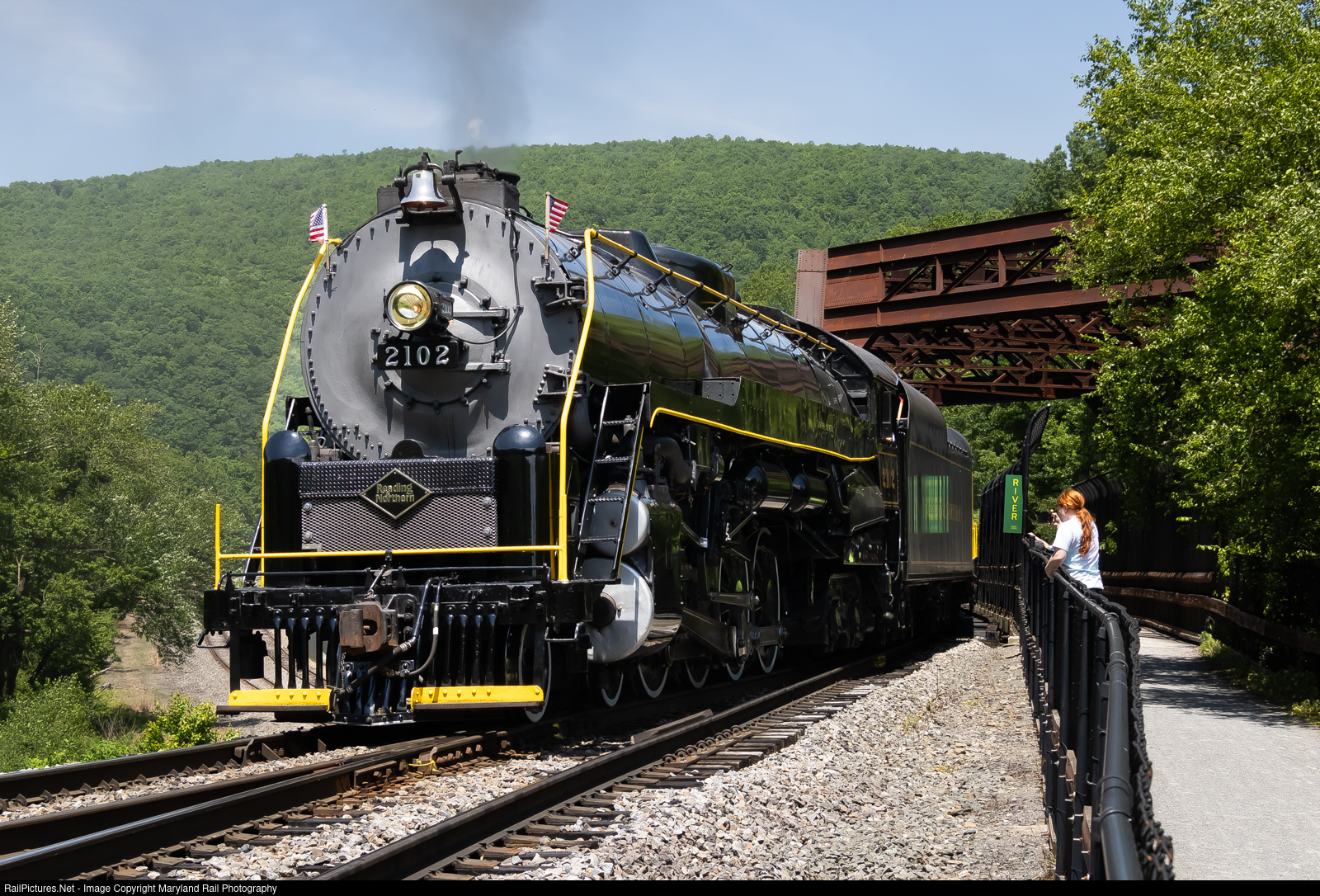 | Reading & Northern's 4-8-4 T1 #2102 crosses over the Norfolk Southern Lehigh Line proceeding through River Junction preparing to turn the train around the wye in Jim Thorpe, PA! |
