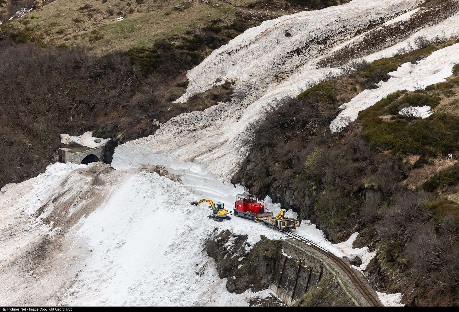 Cogwheel diesel locomotive HGm 2/2 # 51 of the steam railroad Furka Bergstrecke is on its way to Realp with crane wagon X # 2941 "Bruno" through the Furkareuss gorge above the 36 meter long Alt Senntumstafel Tunnel I, passing a yellow Nencki crawler excavator. In the last few days, the snow clearing crew has milled out a deep trench through avalanche snow to open up the track. On this day, the Steffenbach bridge was rebuilt, which is folded down during the winter to allow the avalanches a clear path. The summer season will start on june 20th.