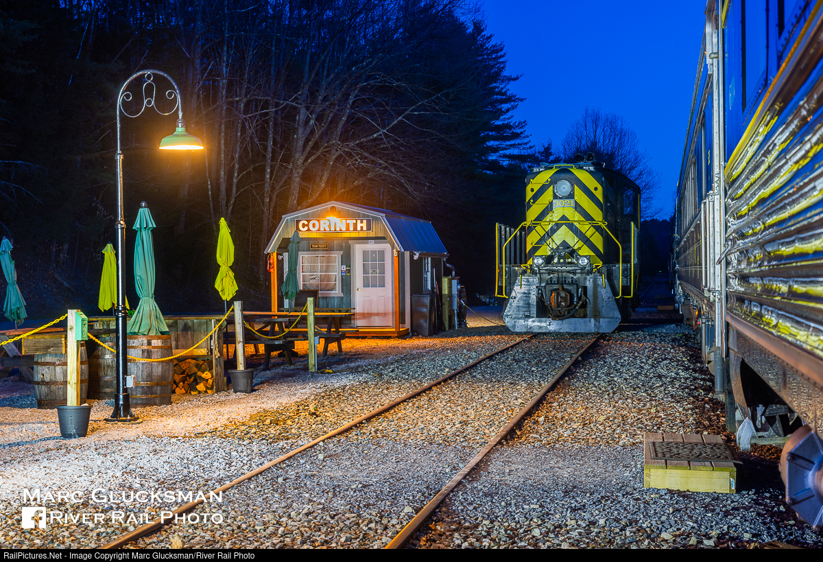 Night At Corinth. Saratoga Corinth & Hudson Railway S2 3021 (ex-SNC 821, exx-UHRR 821, exxx-SIRT 821, née-USAX 7108, Alco S2, 7/1943) was parked for the evening on Friday, April 26, 2024 in Corinth, New York, awaiting the call to lead to Hadley, New York the next day. The paint and the sign on the SCH Corinth station match in D&H style, but the recently restored lamppost is authentic Delaware & Hudson Railway.