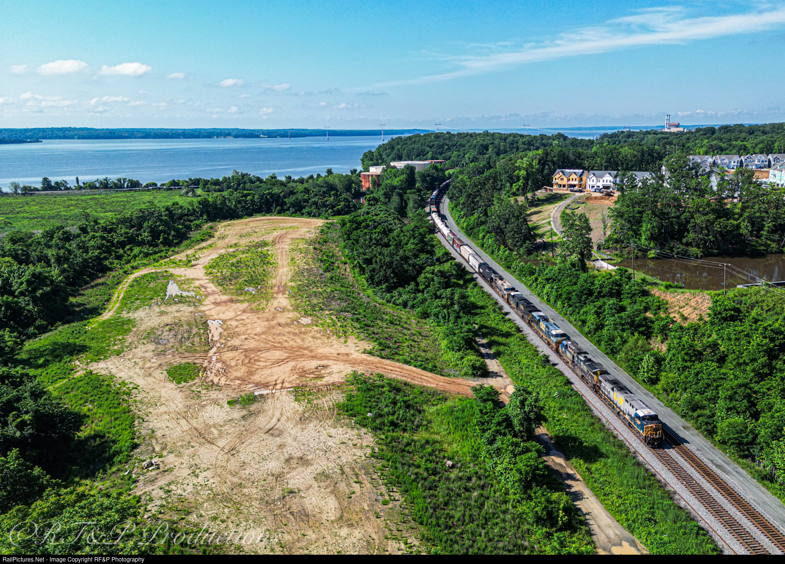 | Old Reliable: CSXs Louisville & Nashville Heritage Unit #1850 leads the NB Manifest M422 through the Potomac Shores neighborhood on a sunny Sunday morning with 4 additional engines in tow on the head end. The pictured plot of land to the left of the train is what we believe to be the future location for the VRE Potomac Shores passenger station…time will eventually determine the accuracy of that guess. |