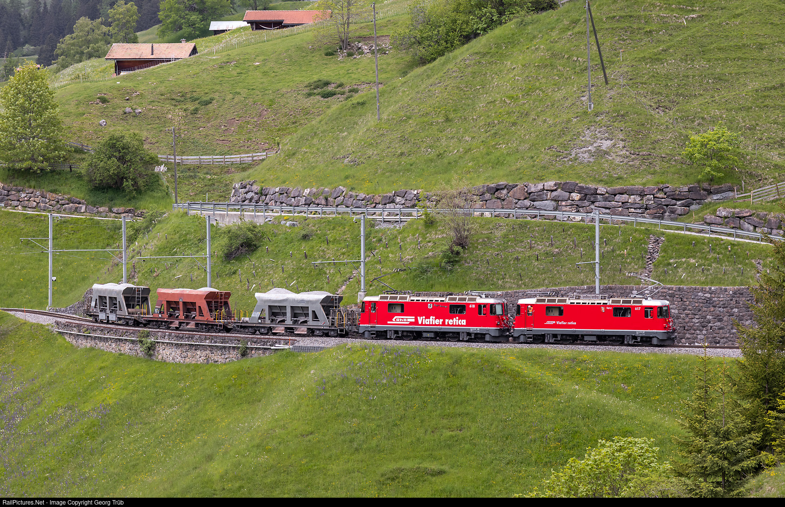 Last October, the Rhaetian Railway parked the 6 ABe 4/4 # 51 to # 56 railcars on the Bernina line. As a result, during the summer half-year, when the various Bernina Express trains are running, there is now an average shortage of around 2 “Allegra” dual-current railcars (ZTZ) to cover all services, especially on the Bernina and to Arosa. For this reason, push-pull trains with Ge 4/4 IIs are now used between Chur and Arosa, and freight trains are also operated with two Ge 4/4 IIs. Freight train 5435 fromChur to Arosa is heading uphill between Peist and Langwies with Ge 4/4 II # 617 and # 618 in multiple control and 3 loaded Fac gravel cars.