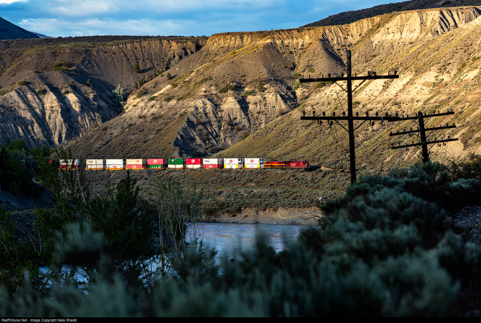 | CP 8031 leads Canadian Pacific's Hotshot intermodal 101 westbound in the last moments of the sunlight on the approach to the east-end signal at Ashcroft, BC on the CP Thompson Subdivision. |