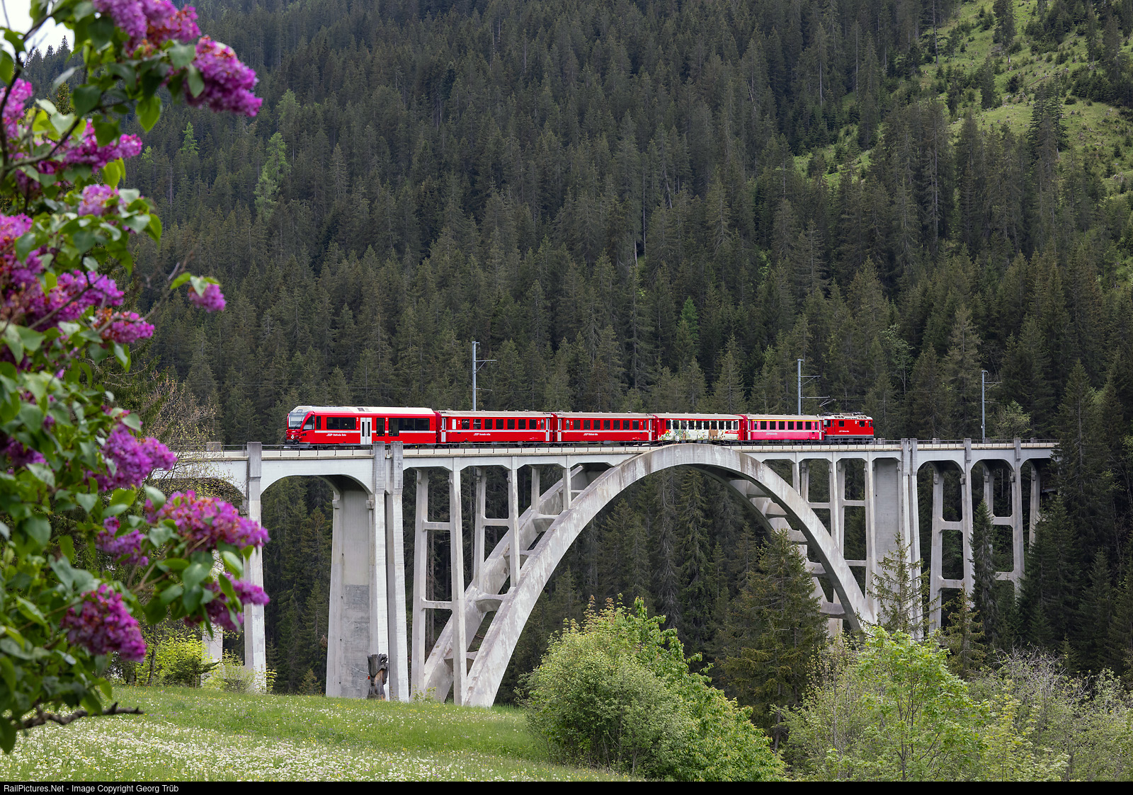 Last October, the Rhaetian Railway parked the 6 ABe 4/4 # 51 to # 56 railcars on the Bernina line. As a result, during the summer half-year, when the various Bernina Express trains are running, there is now an average shortage of around 2 “Allegra” dual-current railcars (ZTZ) to cover all services, especially on the Bernina and to Arosa. For this reason, push-pull trains with Ge 4/4 IIs are now used between Chur and Arosa, and freight trains are also operated with two Ge 4/4 IIs. Regional train 1433 of the line R16 from Chur to Arosa is crossing the 62 meter high and 284 meter long Langwieser viaduct, built in 1912 to 1914. When built is was the largest concrete bridge of the world.