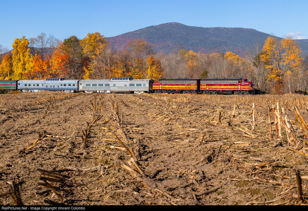 F7s 4628 and 4266 are seen at Hussey's field in Conway bound for Fabyan's. This is the annual 470 Railroad Club Excursion on the Conway Scenic Railroad. The club is utilizing their own two F7s as the main motive power while 252 and 255 are on the rear for help up and down the mountain.