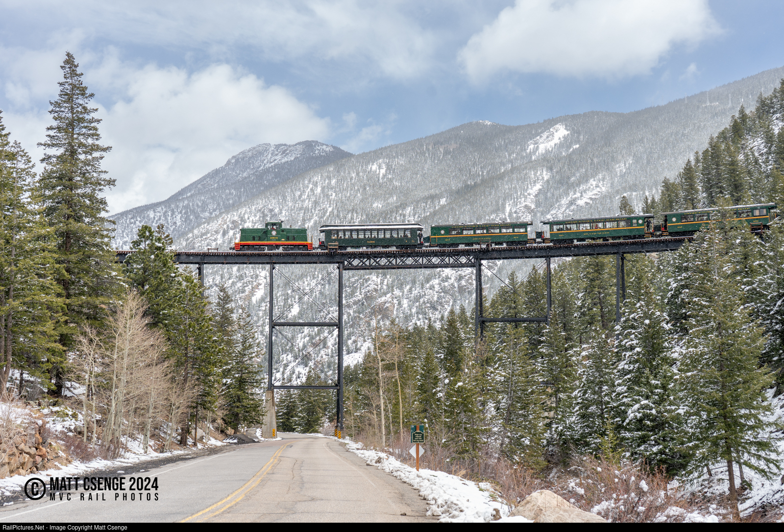 With a snow-covered Saxon Mountain creating a splendid backdrop, Georgetown Loop Railroad 80-ton centercab no. 1934 (GE, 1951) is seen with its train on the iconic High Bridge over Loop Dr and Clear Creek. |