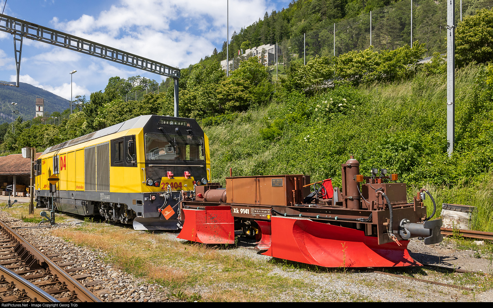| "Schalke" diesellocomotive Gmf 234 # 04 "Bernina" of the Rhaetian Railway in Chur Sand depot, with track plough Xk # 9141. This track plough was the prototype for other vehicles, built in 1966 already by company Ernst Stadler in Zürich, the later StadlerRail. The design of this vehicle differs in various details from the later built Xk # 9142 to # 9148 from 1968 to 1988. |