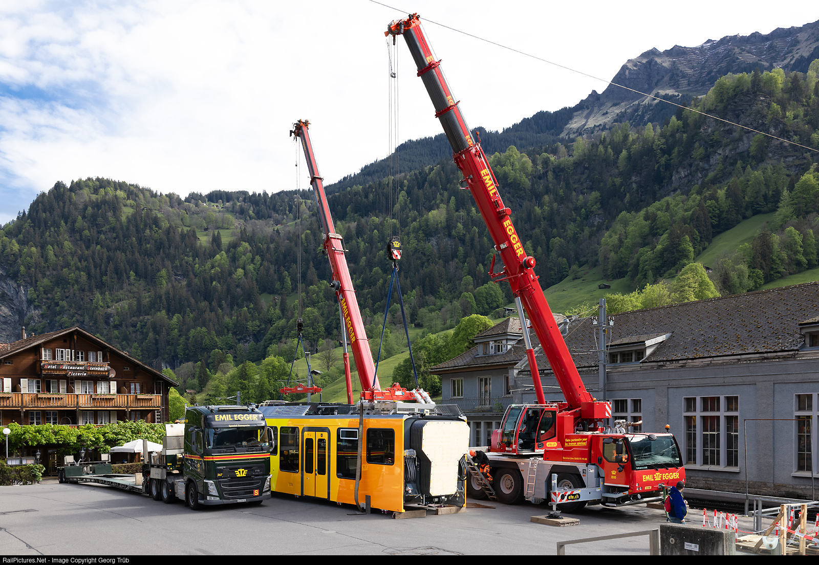 On May 13, 2024, the second new Be 4/6 # 101 train was delivered by StadlerRail for the Lauterbrunen-Mürren mountain railroad, more precisely the adhesion line between Grütschalp and Mürren. The second car body has just been unloaded from the Emil Egger company's low-loader by two mobile cranes and deposited on the station square in Lauterbrunnen for transportation to Winteregg the following day.