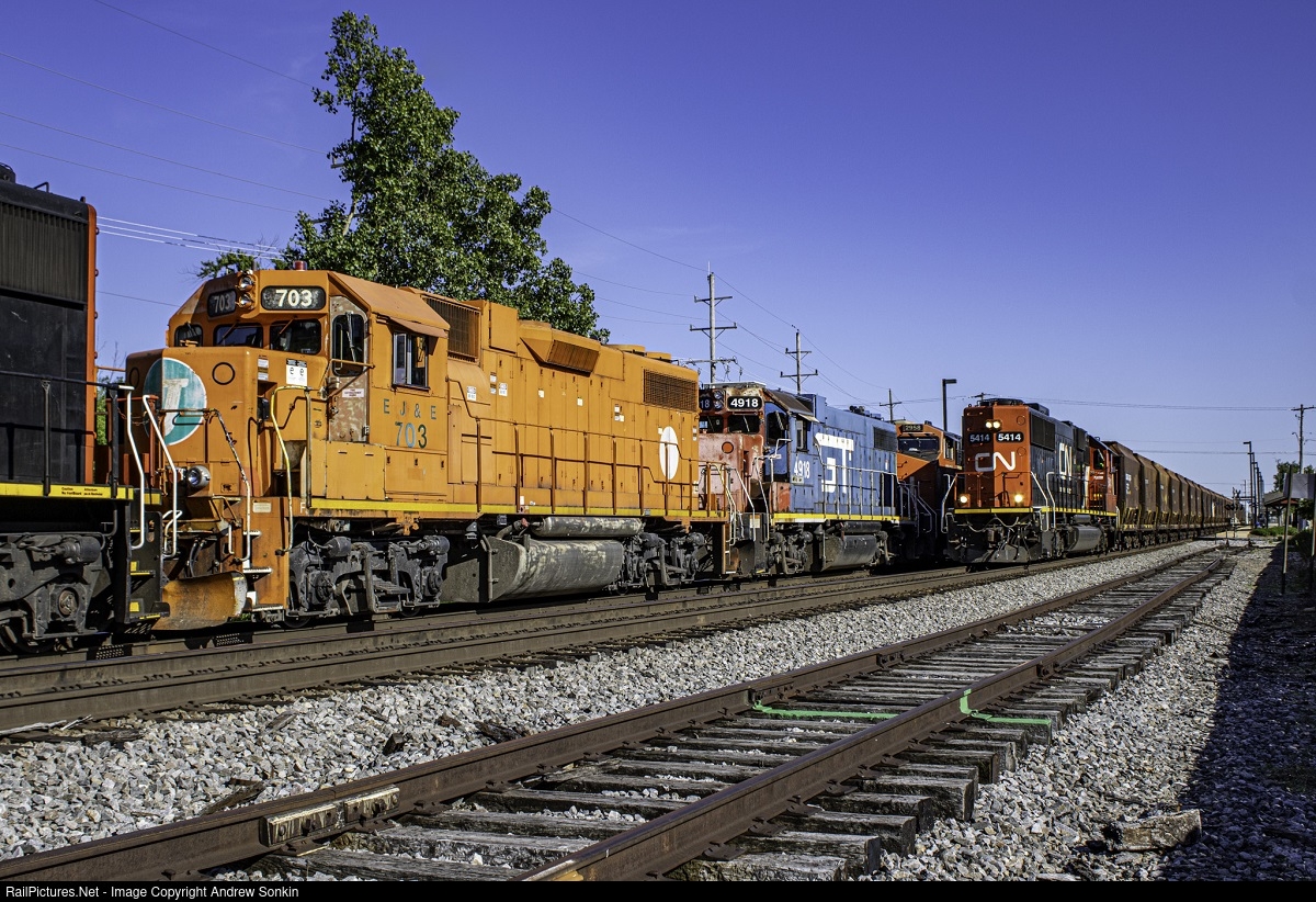 CN Local Rock job L704 (Sussex-Mundelien) heads back north after collecting it's empties to take back to Sussex Wi with the CN EMD SD60 No. 5414 leading LHF. Stopped for Metra NCS Rush and opposing traffic is CN M336 (Green Bay to Kirk Yard) with 2 veteran machines in the consist. The GTW 4918 and EJE 703, both GP38-2s.