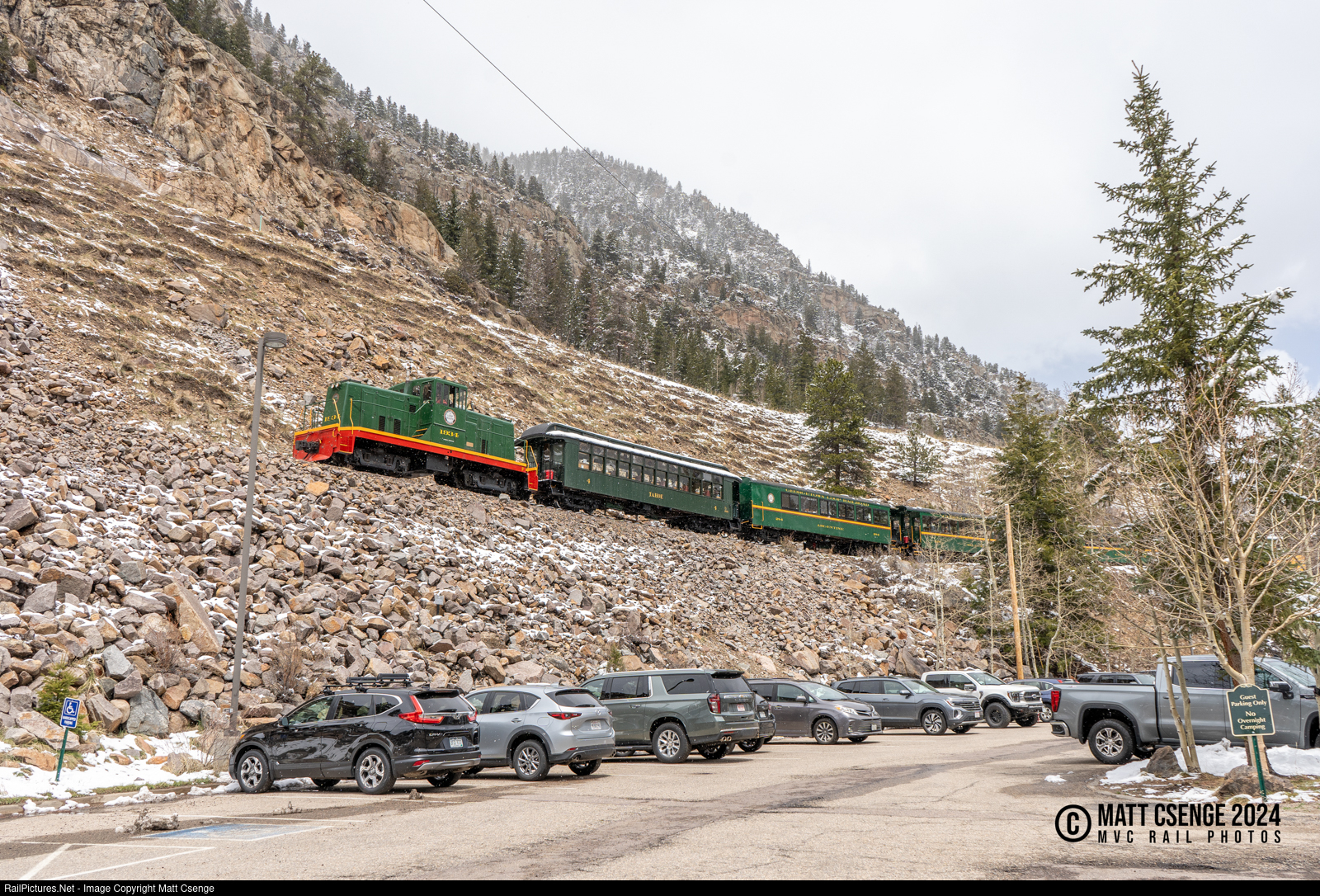 Looping the Lot. Georgetown Loop Railroad 80-ton centercab no. 1934 (GE, 1951) descends past the attraction's parking lot as it loops around and back to the Georgetown station.