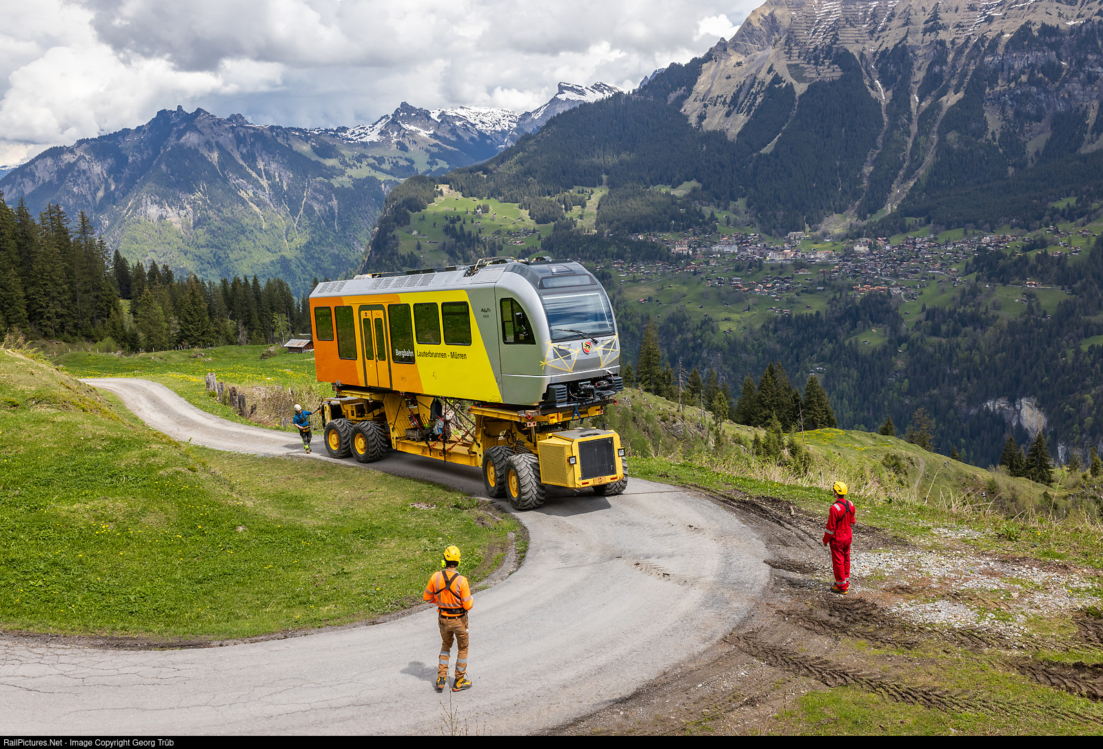 The Lauterbrunnen-Mürren mountain railroad (BLM), which belongs to the Jungfraubahn Holding, consists of an aerial cableway from Lauterbrunnen to Grütschalp and a meter-gauge adhesion railroad a good 4 kilometers long from Grütschalp via the Winteregg crossing station to Mürren. StadlerRail is supplying three new Be 4/6 # 101 to # 103 double railcars for the Grütschalp-Mürren line. The first vehicle # 102 was delivered in October 2023 already for tests. On 13 and 14 May 2024, the two car bodies of train # 101 "Eiger" were transported by special transport from Lauterbrunnen (797 meter a.s.l.) via mountain roads to Winteregg (1578 meter a.s.l.), where they were mounted on the bogies. The special vehicle "Castor + Pollux", which belongs to the company Mountaintrans AG, was used for the transport. Von Rotz & Wiedemar Seilbahnen in Kriens, in collaboration with Wipfli Transporte AG, is responsible for the know-how, operation and maintenance. The journey on the 7,5 kilomter long, partly not paved road to the Winteregg needed about 4 hours. The transport is now below Winteregg, with the village of Wengen on the other valley side. The Castor+Pollux special transport vehicle travels at approximately walking speed and is radio-controlled by operators on foot.