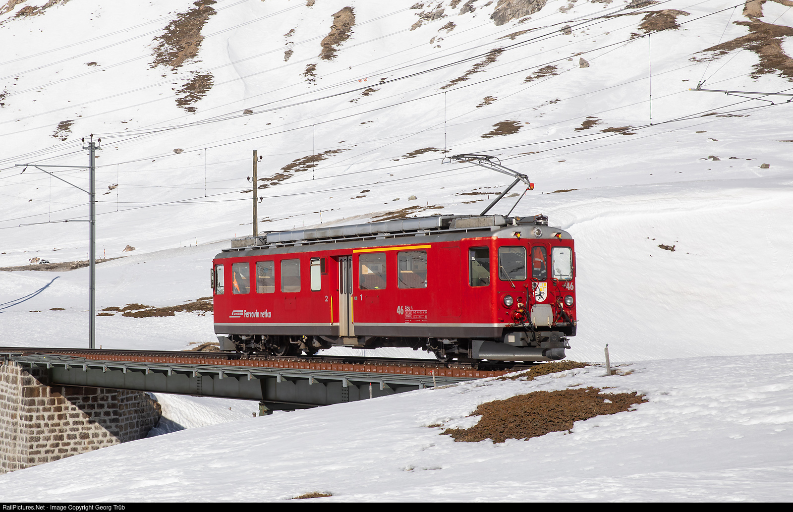 Railcar "Tw II" ABe 4/4 # 46 of the infrastructure department is crossing the Ova da Bernina bridge between Bernina Lagalb and Ospizio Bernina. In the meantime the railcar got a new paint approximates the time of delivery in 1965 and is referred to as “Goldliner”. It will be preserved as historic vehicle in the future.