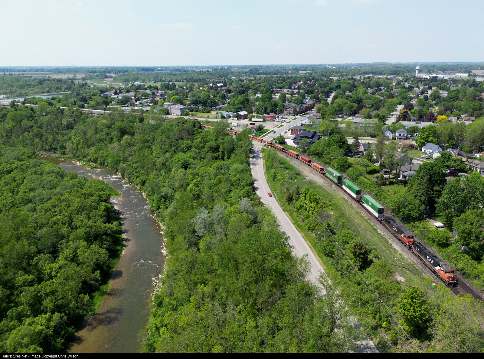 | CN's Chicago Intermodal, IL - Montreal Taschereau, PQ "vehicle" train passes through the town of Paris along the Nith River |