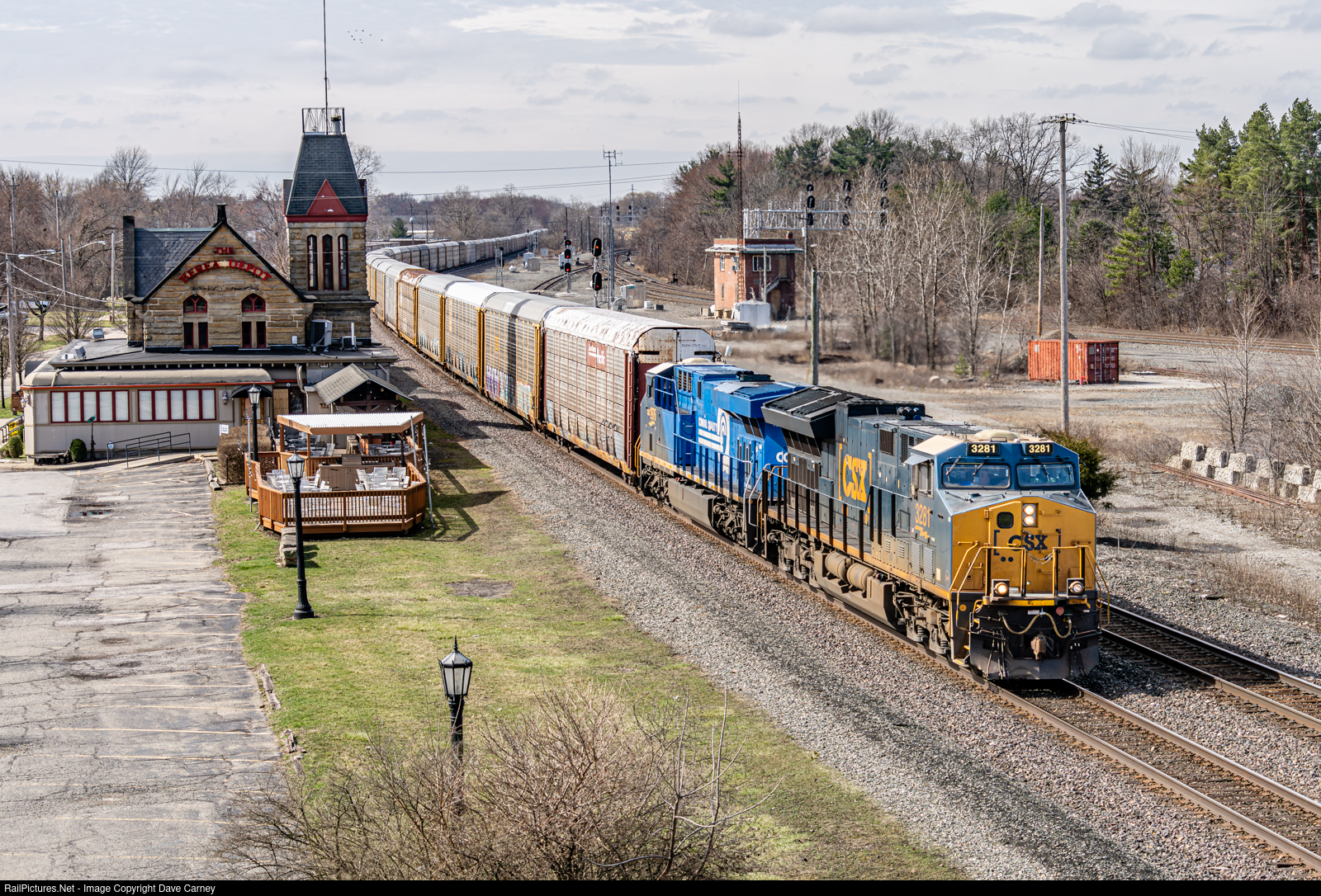 | An eastbound autorack passes the depot in Berea, Ohio, with CSX's Conrail heritage unit in tow. BE tower can be seen in the background. |