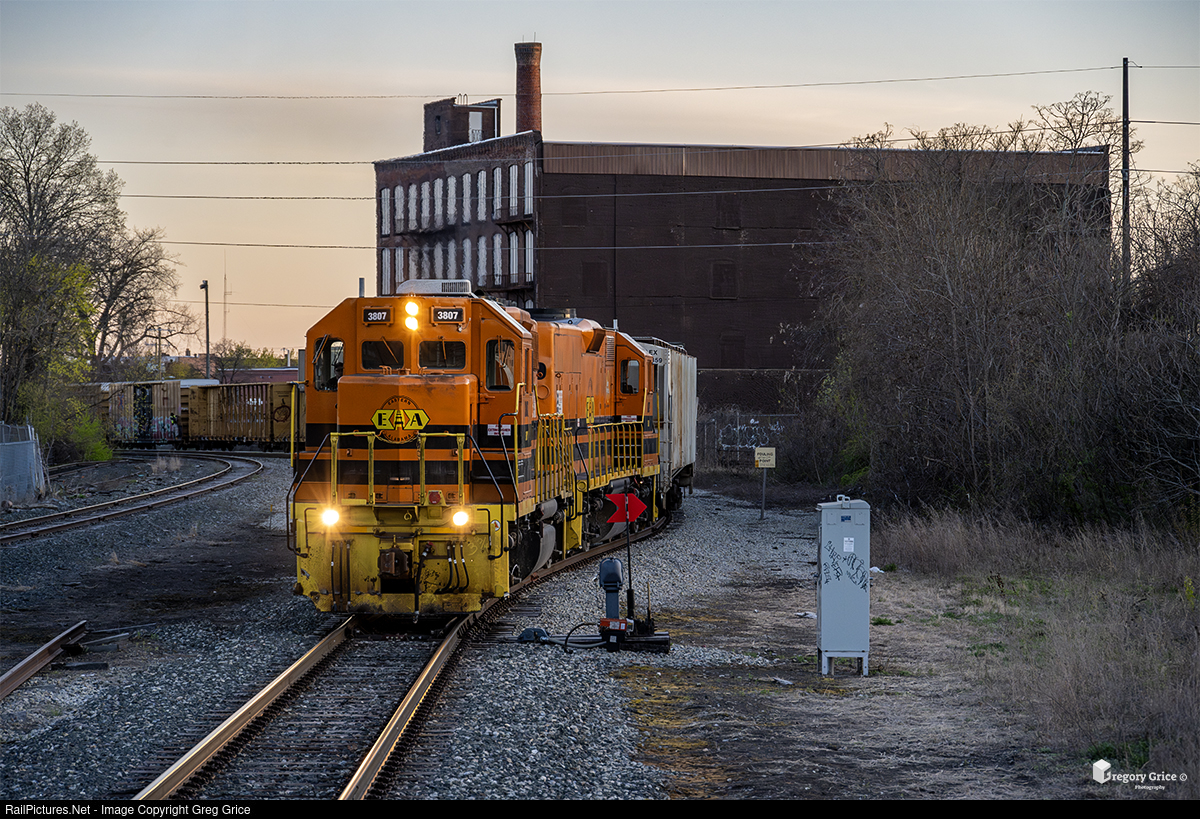 As the sun sets on April 25th, 2024, Berkshire & Eastern (B&E) "EDPL", with Eastern Alabama Railway (EARY) EMD GP40-2 Mother-Slug combo 3807 / 807 leading, pulls out onto the MassDOT Connecticut River mainline at Holyoke, Massachusetts.