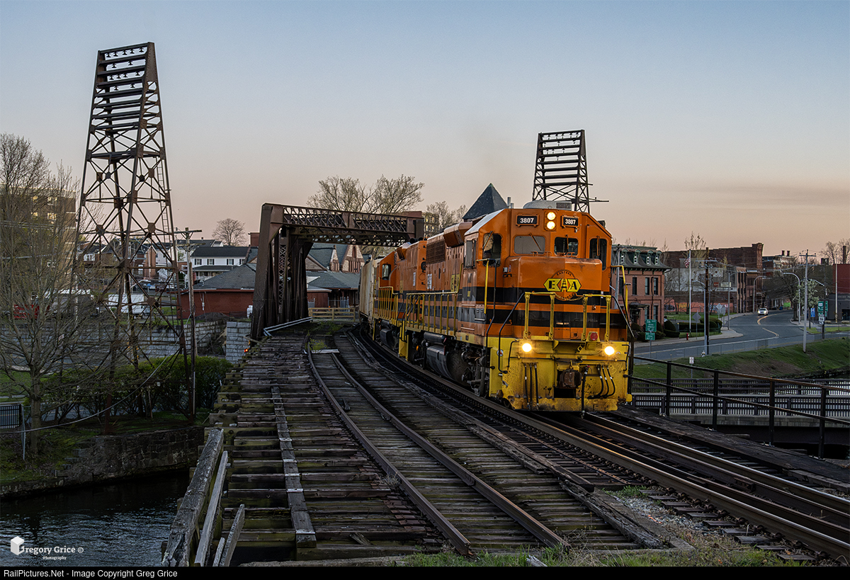 As the sun sets on April 25th, 2024, Berkshire & Eastern (B&E) "EDPL", with Eastern Alabama Railway (EARY) EMD GP40-2 Mother-Slug combo 3807 / 807 leading, heads north out of Holyoke, Massachusetts on the MassDOT Connecticut River Line.