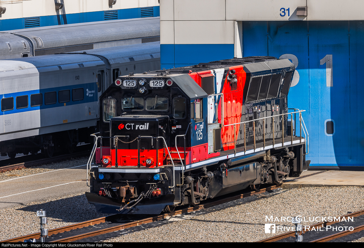Branded. On Saturday, June 1, 2024, BL20GHM MNCW 125 sits outside of the MTA Metro-North Railroad Croton Harmon Engine Facility in Croton-On-Hudson, New York. Originally painted in a McGinnis/Mater New Haven Railroad tribute, the locomotives returned from overhaul in Connecticut's new "coke zero" scheme, but without the branding. This unit is the first to visit the paint shop again and receive the "CTrail" name and logo on both the front and side of the cab.