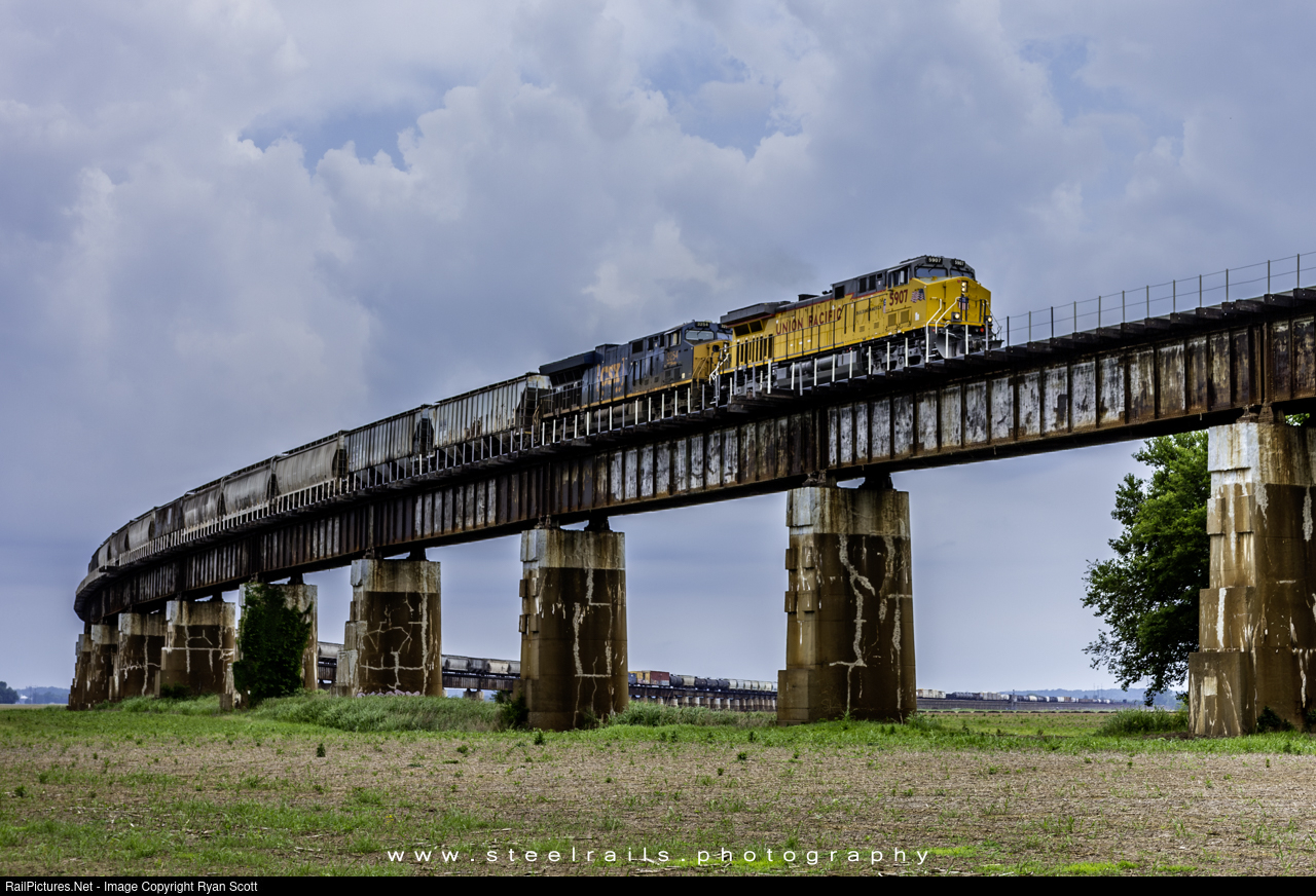 Union Pacific, UP 5907, a GE AC44CWCTE, led CSX mix freight south over the viaduct to the Ohio River bridge into Henderson, Kentucky from Evansville, Indiana on the Henderson Subdivision on May 24, 2024. The original viaduct was constructed in 1885 by the Louisville and Nashville Railroad. In 1932 the current viaduct was built and was 12,123 feet long, the bridge over the Ohio River taking up 648 feet of that distance. The span over the Ohio River was designed and built to be used as a double track and the approach pier has a block puzzle design for interlocking the existing pier to the new pier to allow a second approach. However, the second approach was never built, and a CSX employee told me that the track on the bridge was too close for the harmonic rocking of the trains.