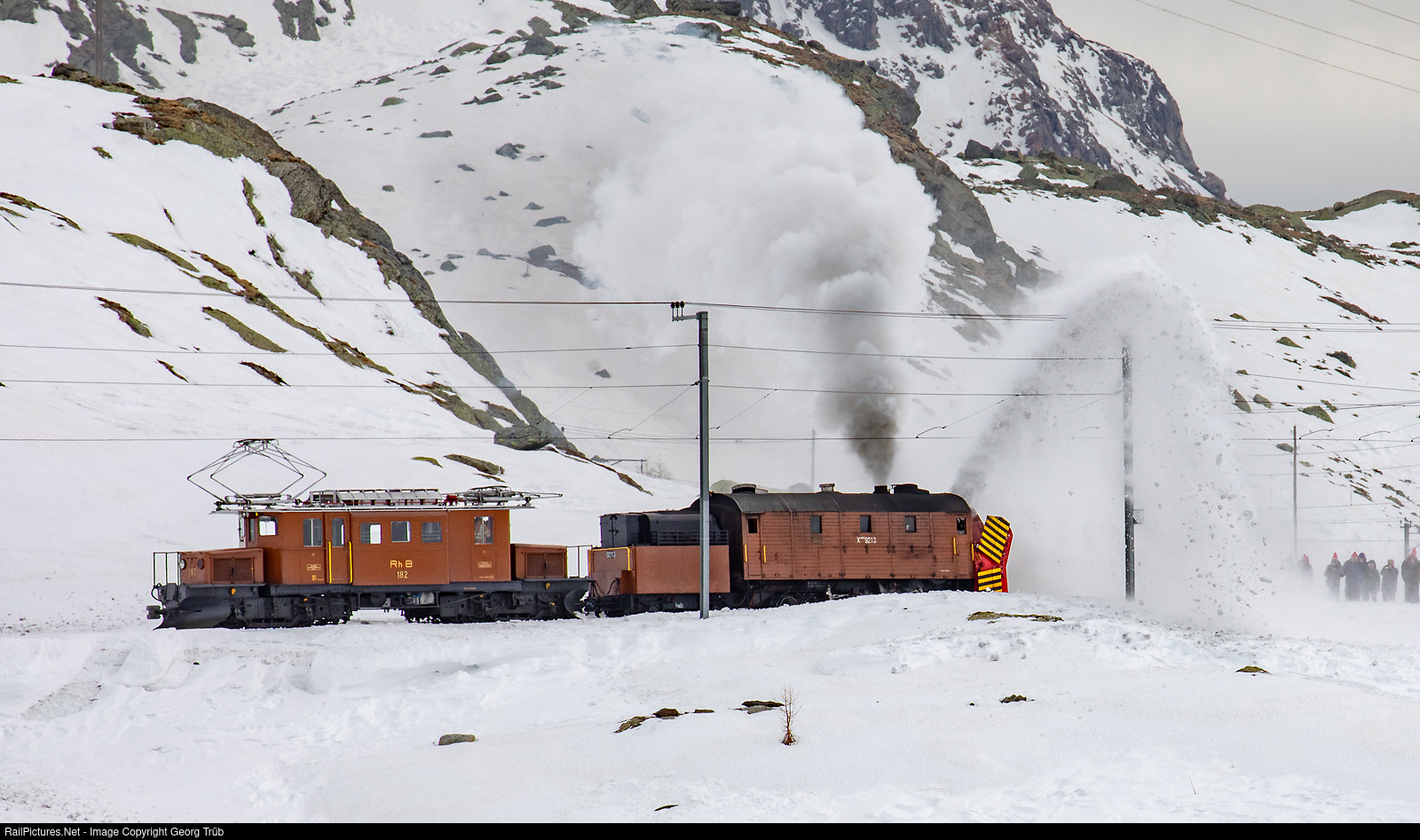 | Snow blowing demonstration with 0-6-0+0-6-0 self propelled steam rotary snow blower Xrot d # 9213 and the "Bernina Crocodile" Ge 4/4 # 182 of the Rhaetian Railway between Ospizio Bernina and Alp Grüm. |