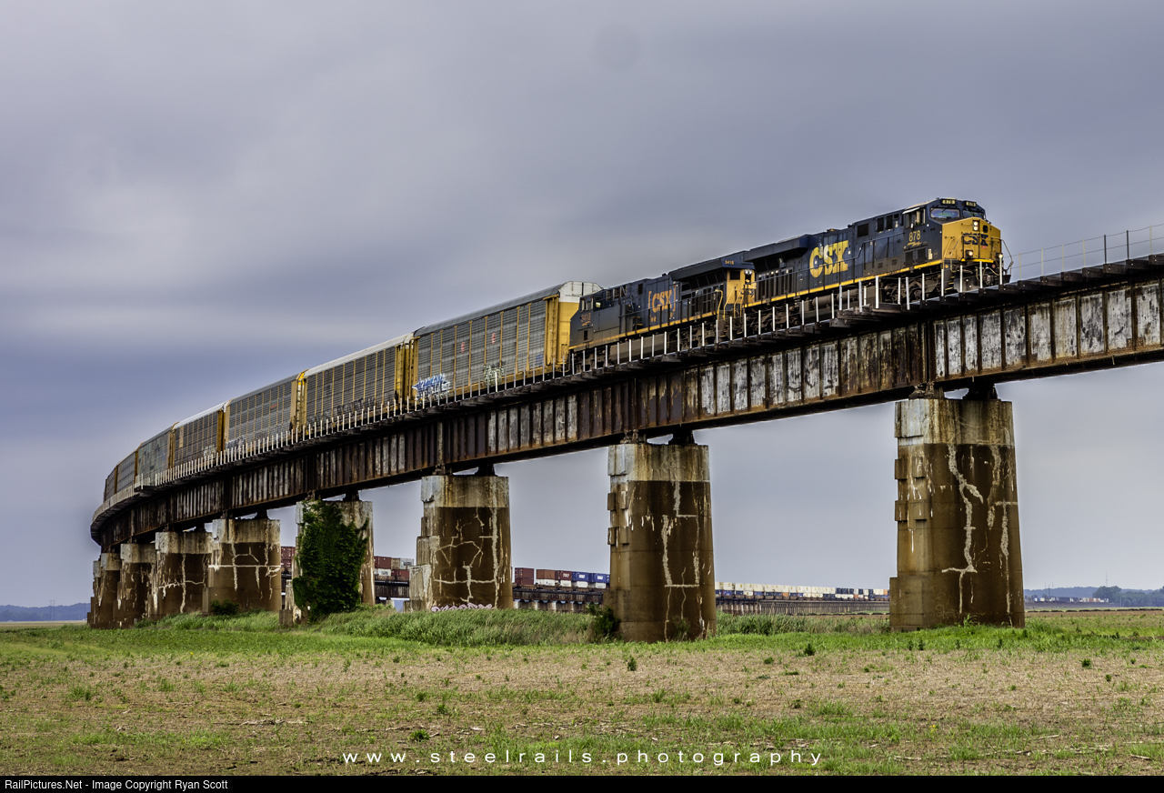On May 24, 2024, CSX Transportation, CSXT 878 a GE ES44AH led CSX ID I025 south over the viaduct to the Ohio River bridge into Henderson, Kentucky from Evansville, Indiana on the Henderson Subdivision.