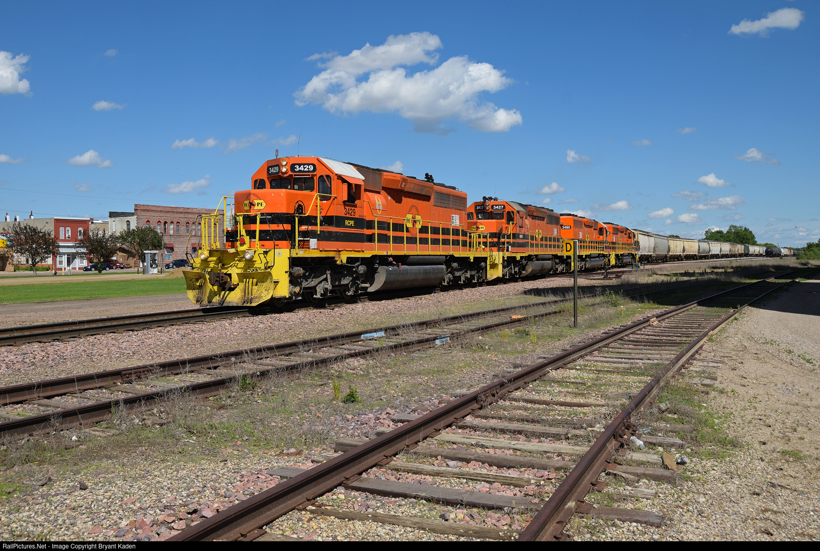 A westbound RCPE train rolls through downtown Tracy, MN. Some of the buildings in the background have seen the passing of many trains, going all the way back to Chicago & North Western days when there was a roundhouse and yard at this once busy junction. Aside from one long siding track that's used for meets or to park trains while they wait for a new crew, most of the yard is rusting away and overgrown with weeds. The derail on the middle track in this photo hasn't been needed in some time as the turnout it protected out of frame to the left was removed quite a while ago.